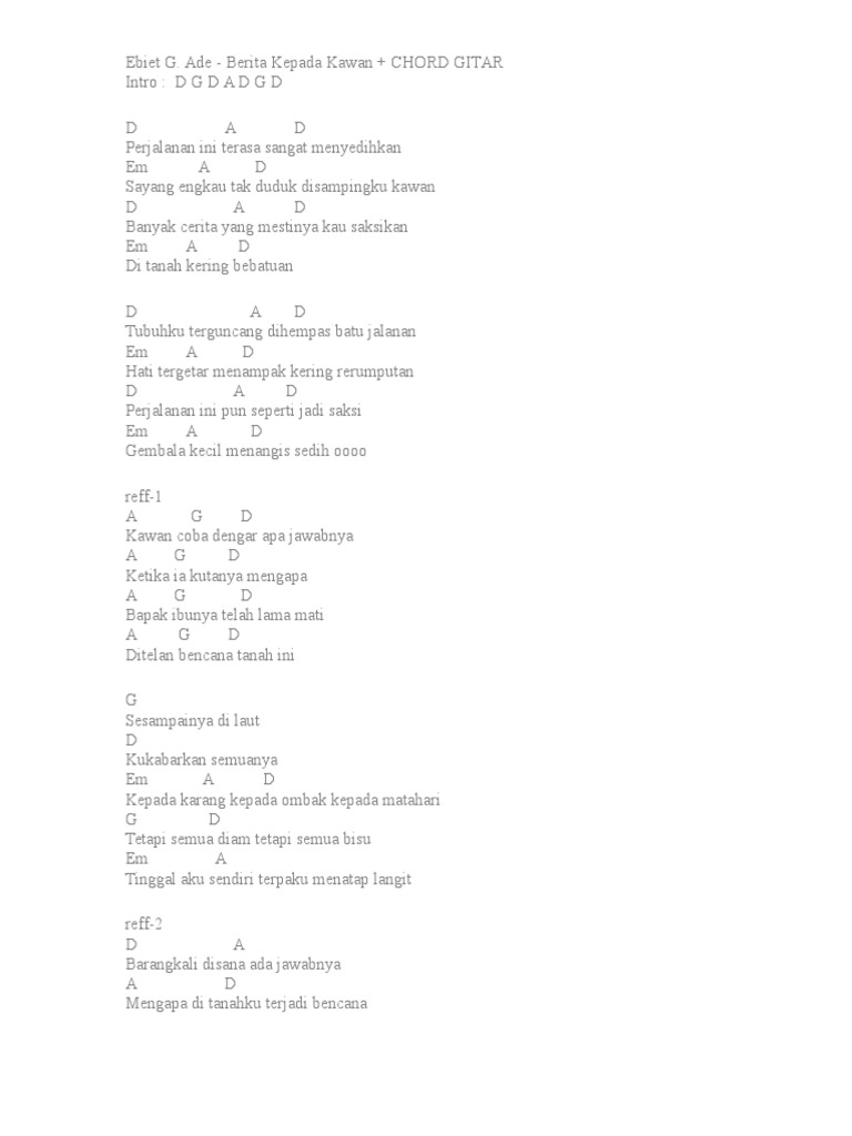 A d terasa sangat menyedihkan em a sayang engkau tak duduk d g di sampingku kawan. Ade berita kepada kawan chord artist. 2nd fret intro c f c g c f c g verse c perjalanan ini g c terasa sangat menyedihkan dm g sayang engkau tak duduk c f disampingku kawan c banyak cerita g c yang mestinya kau saksikan dm g c di tanah kering bebatuan g c f berita kepada kawan chords by.