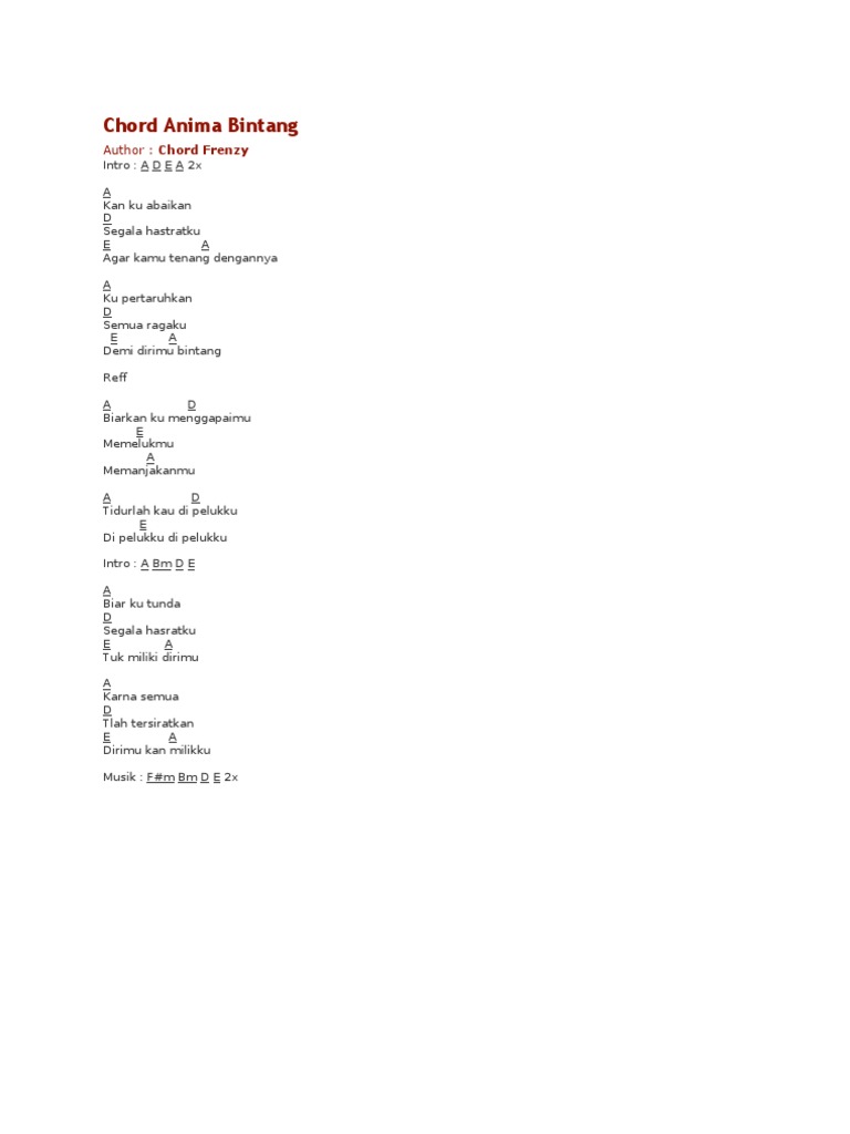 A bm d e a biar ku tunda d segala hasratku e a tuk miliki dirimu a karna semua d tlah tersiratkan e a dirimu kan milikku. Chord anima bintang intro. Capo di fret 2 intro g c d g g c kan ku abaikan segala hasratku d g agar kau pun tenang dengannya g c ku pertaruhkan semua ragaku d g demi dirimu.