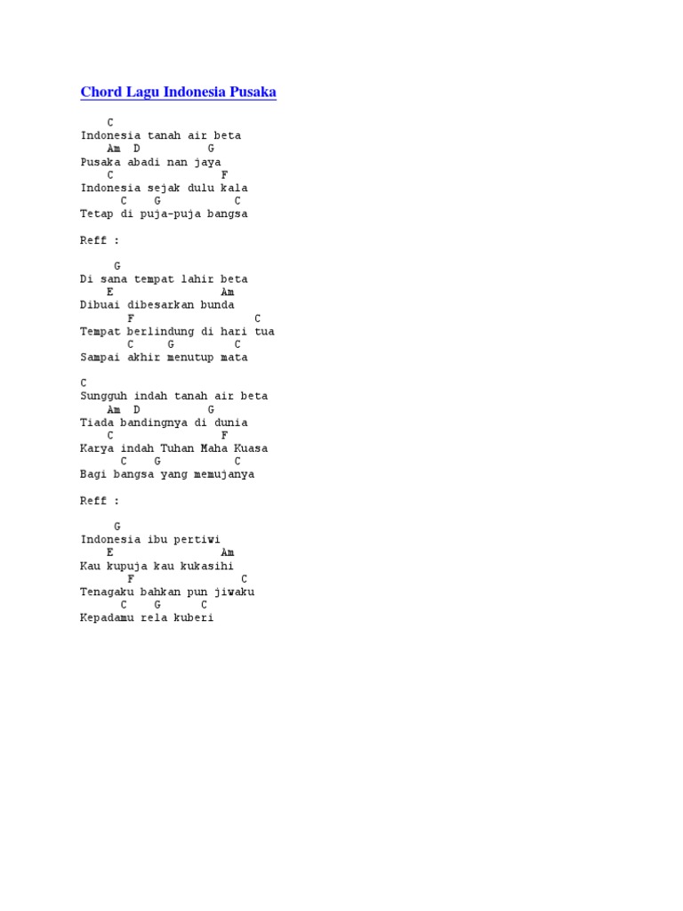 Ismail marzuki g indonesia tanah air beta em am d pusaka abadi nan jaya g c indonesia sejak dulu kala g d g slalu dipuja puja bangsa chorus d di sana tempat lahir beta bm em dibuai dibesarkan bunda c g tempat berlindung di hari tua d g sampai akhir menutup mata melody lead g am bm c d em a a indonesia tanah air beta fm bm e pusaka. Chord indonesia pusaka lagu wajib nasional intro. C g c sampai akhir menutup mata original chord for c f berikut versi intro bait akhir intro.