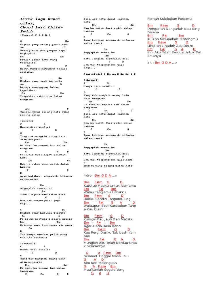 G em engkau yang hatinya terluka am d di peluk nestapa tersapu derita bm em seiring saat keringnya air mata am d tak mampu menahan pedih yang tak ada habisnya chorus2 c g hanya diri sendiri c d g yang tak mungkin orang lain akan mengerti em bm di sini ku temani kau dalam tangismu c cm g d bila air mata dapat cairkan hati em bm kan ku cabut duri pedih dalam hatimu c cm g d agar kulihat senyum. Chord last child pedih intro. G em engkau yang sedang patah hati am d menangislah dan jangan ragu ungkapkan bm em.