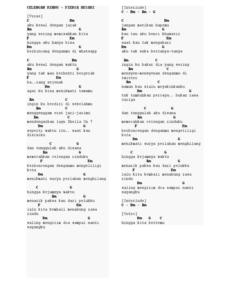 Advertisement verse c bm aku kesal dengan jarak am g yang sering memisahkan kita f em hingga aku hanya bisa dm g berbincang denganmu di whatsapp c. Chorus g d dan tunggulah aku disana em f g memecahkan celengan rinduku c berboncengan denganmu g mengelilingi kota am d menikmati surya perlahan menghilang g d hingga kejamnya waktu em f g menarik paksa kau dari pelukku c lalu kita kembali g menabung rasa rindu am saling mengirim doa d g sampai nanti sayangku. Fiersa besari celengan rindu by irvan.