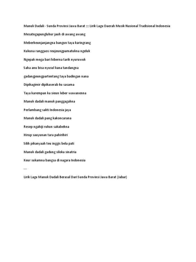 Berikut yang merupakan lagu daerah yang berasal dari jawa barat adalah. Download lagu lagu manuk dadali berasal dari daerah mp3 dapat kamu download secara gratis di untung music. Manuk dadali artinya burung garudalagu ini juga bernafaskan nasionalisme dengan melukiskan keperkasaan burung garuda dengan lambang dari kejayaan indonesia.