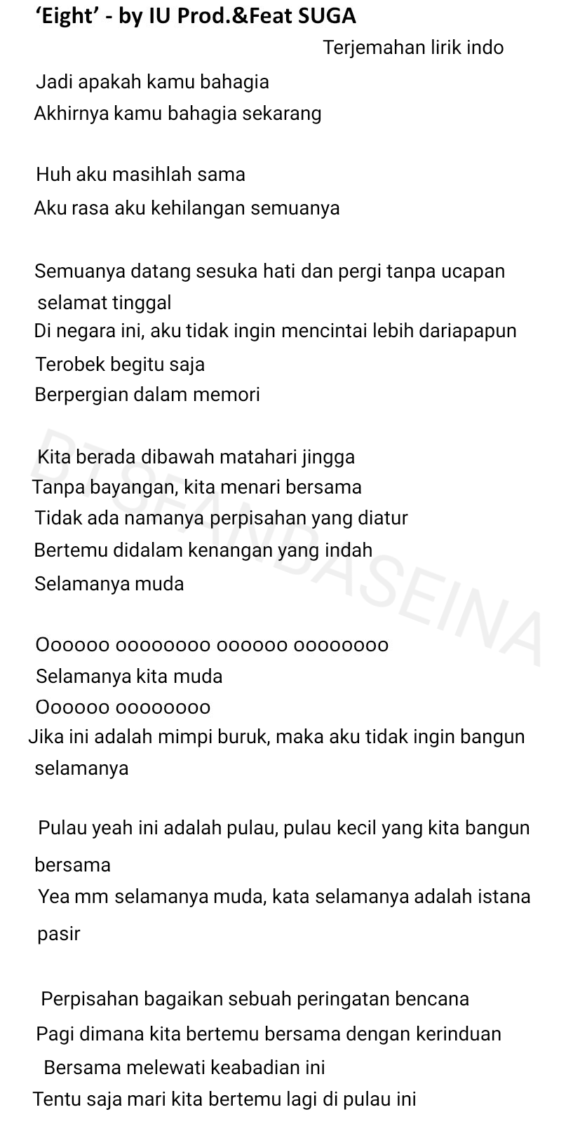Lirik lagu eight iu dan terjemahannya Indeed recently is being hunted by users around us, maybe one of you. Individuals now are accustomed to using the net in gadgets to see image and video data for inspiration, and according to the title of this article I will discuss about Lirik Lagu Eight Iu Dan Terjemahannya.