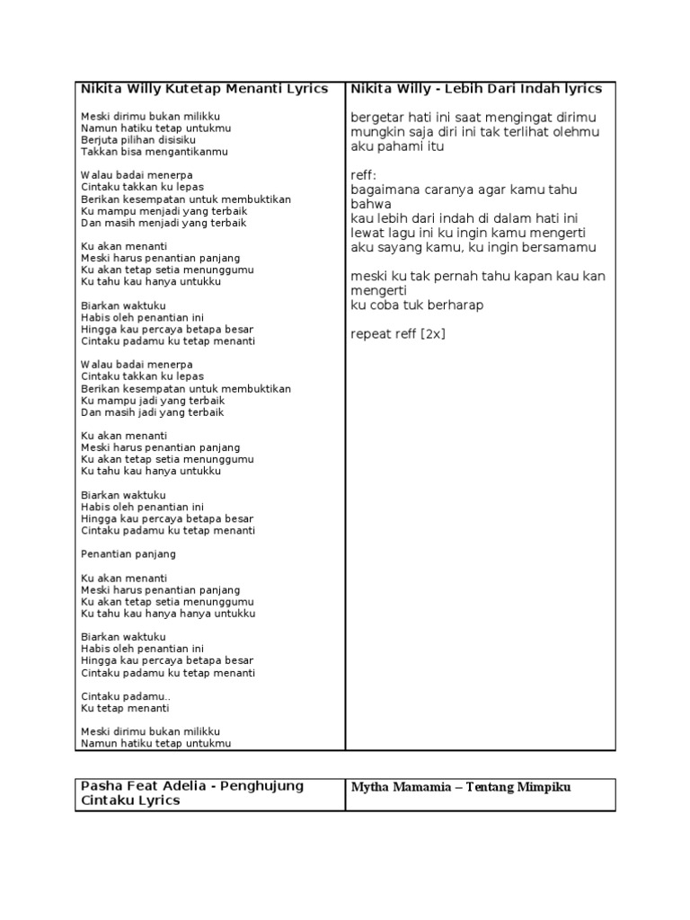 Lagu anak paud mp3. Dimana bisa aku temukan kenyamanan rindu engkau beri. Lirik lagu ku tetap menanti. Berikut cuplikan syair nyanyian teks lagunya dimana bisa aku temukan kenyamanan yang dulu kau beri andaikan kau tahu di sini ku rindu akan semua kenangan kita ku harap di sana kau bahagia ku harap kamu tak.