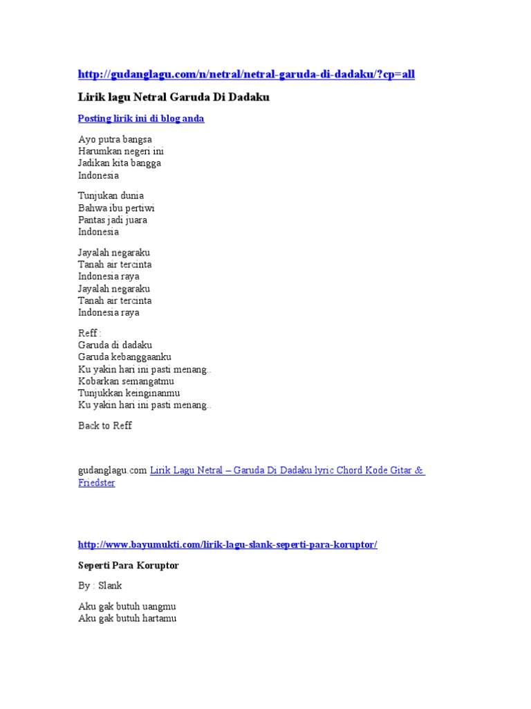 Garuda di dadaku garuda kebanggaanku ku yakin hari ini pasti menang. D g a d e indonesia kobarkan semangatmu a. Indonesia dengarlah suaraku g kan kubawa sampai akhir langkahku bm f jangan pernah menyerah a eg g sudah terlalu lama kita terlelap a merah putih kan slalu di hati.