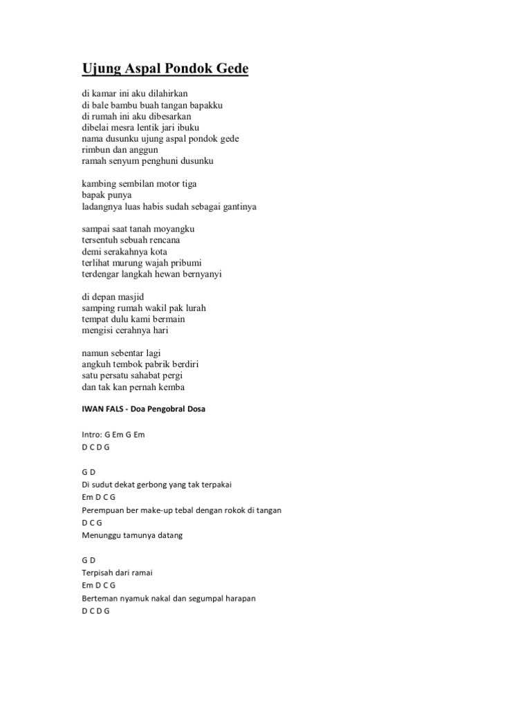 Berikut cuplikan syair nyanyian teks lagunya di kamar ini aku dilahirkan di bale bambu buah tangan bapakku di rumah ini aku dibesarkan dibelai mesra lentik jari ibu nama dusunku ujung aspal pondok gede rimbun dan anggun. Lirik lagu iwan fals ujung aspal pondok gede di kamar ini aku dilahirkan di bale bambu buah tangan bapakku di rumah ini aku dibesarkan dibelai mesra lentik jari ibuku nama dusunku ujung aspal pondok gede rimbun dan anggun ramah senyum penghuni dusunku kambing sembilan motor tiga bapak punya ladangnya luas habis sudah sebagai gantinya.