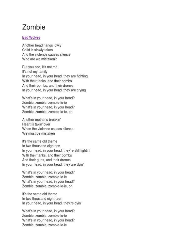Lirik zombie dari the cranberries ini dipublikasikan pada tanggal 24 february 2012 9 tahun yang lalubelum ada info detil tentang single ini. Lagu ini dirilis dalam dua versi bahasa korea dan bahasa inggris. Terjemah lirik lagu baratblogspotcom tempatnya arti lirik lagu dan terjemahan lirik lagu barat.